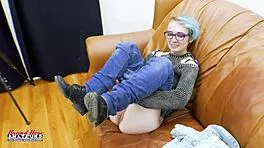 Blue haired Raven gets fingered deep then fucked hard till she swallows every drop!