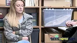 Teen shoplifter caught at work tricks officer into bent over blowjob and doggystyle in office