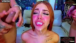 "Look at this submissive redhead Latina teen on her knees, sucking and getting face fucked hard."